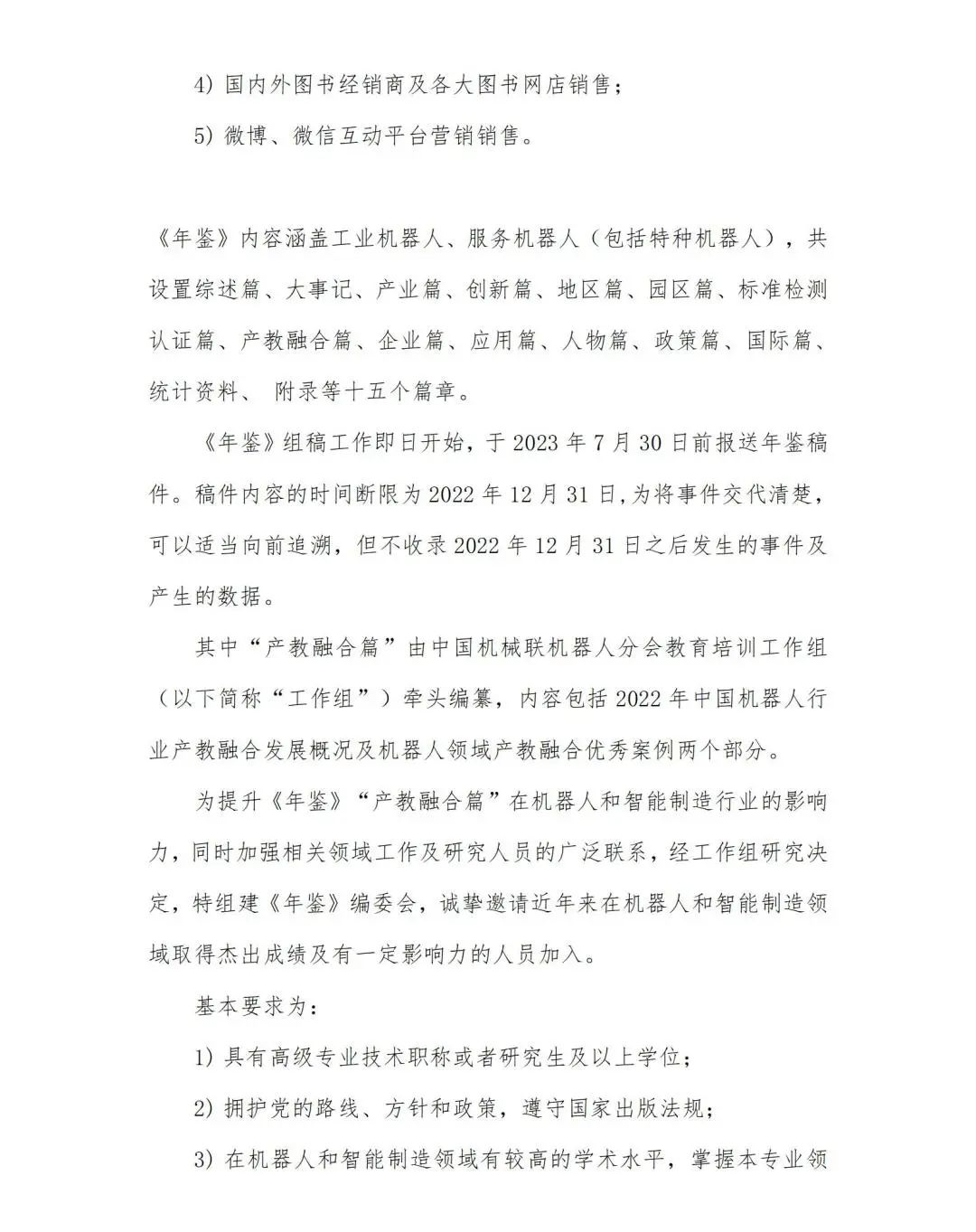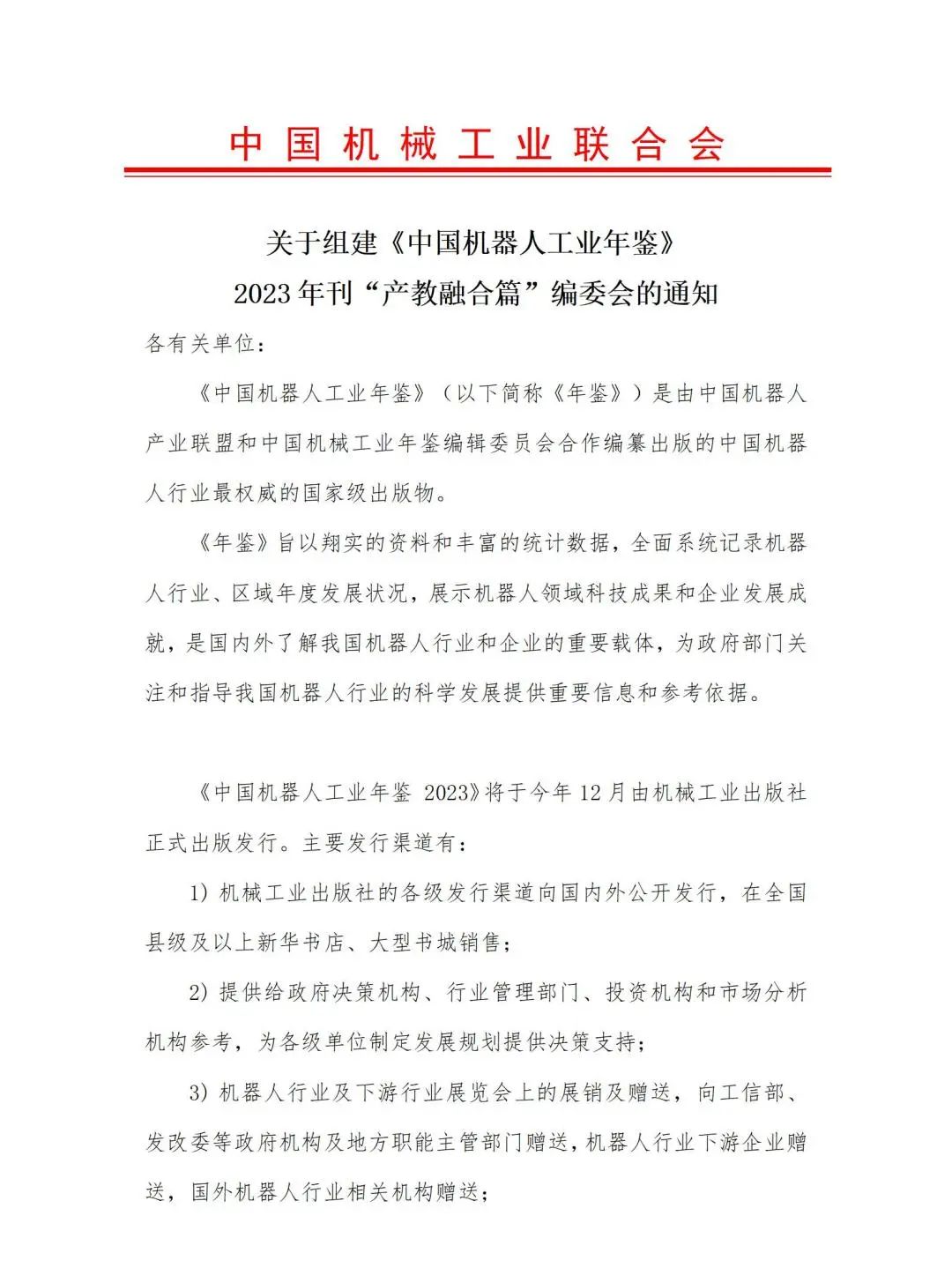 《中国机器人工业年鉴 2023》(以下简称年鉴)征稿工作正式启动,并将于今年 12 月由机械工业出版社正式出版发行。《年鉴》内容涵盖工业机器人、服务机器人(包括特种机器人),共设置综述篇、大事记、产业篇、创新篇、地区篇、园区篇、标准检测认证篇、产教融合篇、企业篇、应用篇、人物篇、政策篇、国际篇、统计资料、 附录等十五个篇章。《中国机器人工业年鉴 2023》产教融合篇将由中国机械工业联合会机器人分会教育培训工作组(原中国机器人产教融合联盟)组织撰写。